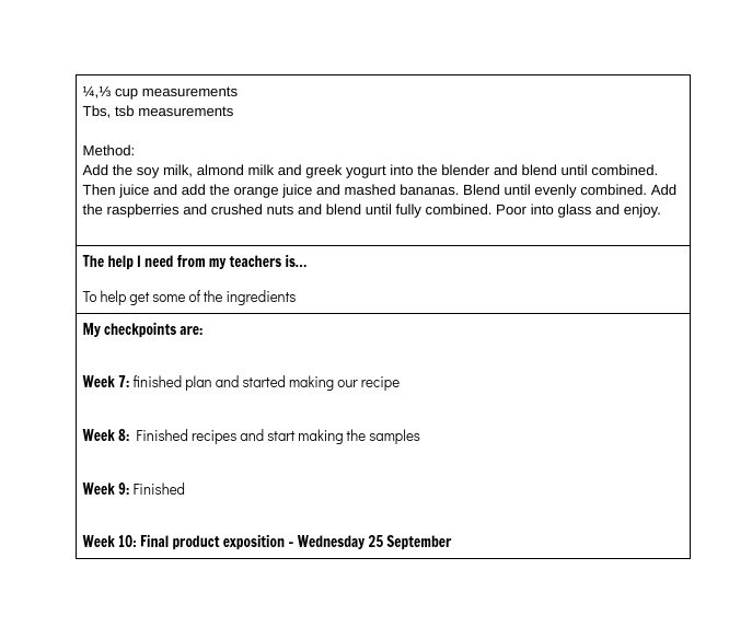 As we get closer to our PBL sharing day (2 weeks away!!!) we have started to focus more on PBL and what we are doing. My partner and I have decided we would make a start up company. We are going to be making foods that are based around the future as we imagine it in 30 years. We are making 2 different foods. One is a smoothie and the other is a sandwich. Here is my planning doc:
